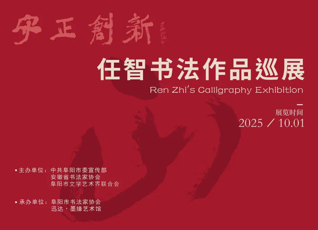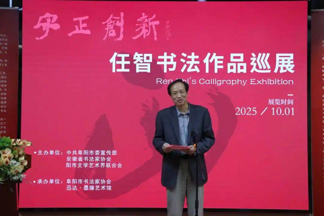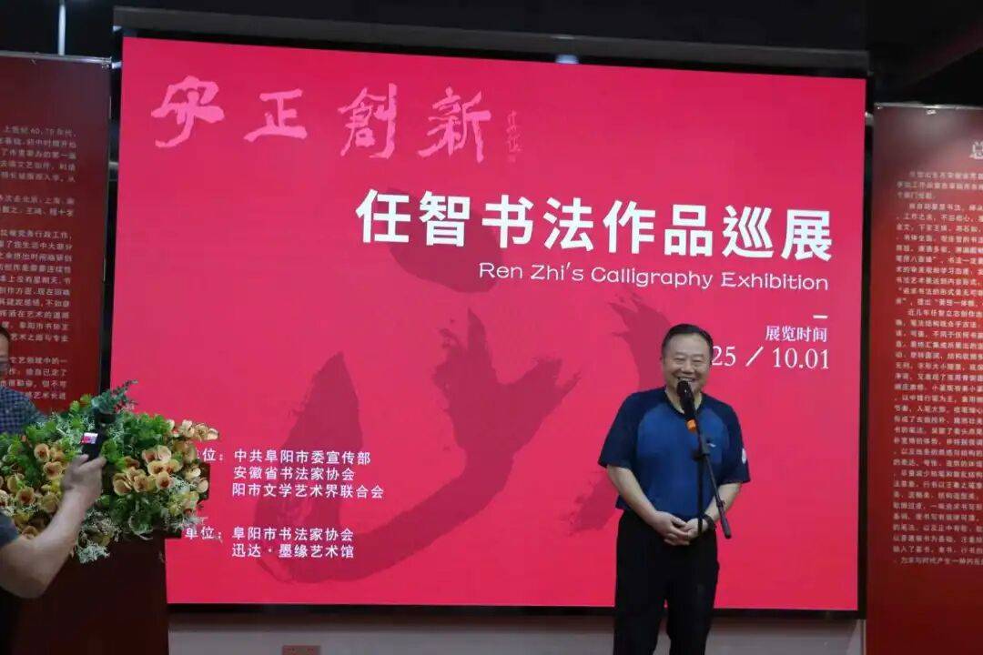 丹桂飘香,金菊溢芳,大湖名城,惠风和畅。这样美好的日子,一定会有许多好事喜事发生。2025年10月1日上午九点半,在普天同庆中华人民共和国76周年华诞的大喜日子里,由中共阜阳市委宣传部、安徽省书法家协会、阜阳市文联共同主办的“守正创新——任智书法作品巡展”在安徽迅达·墨缘艺术馆隆重举行,这是继5月26日在中国国家画院美术馆成功举办后的再次展出。