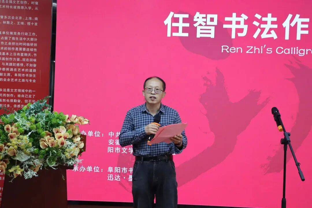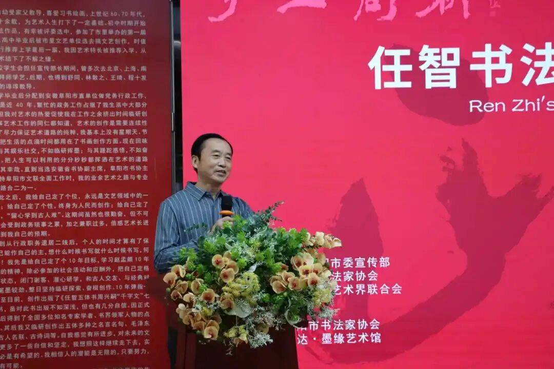 中共阜阳市委宣传部副部长、一级调研员高思杰在致辞中讲到:任智先生是我市书法家中的杰出代表。在漫长的艺术历史长河中,能造就一种书体或两种书体的艺术家大有人在,而多体兼成的艺术家少之又少。任智先生崇尚经典,学习经典,又立足创造,融合发展,传承经典。此次展览于今年5月在中国国家画院美术馆首次展出,在全省乃至全国书画艺术、社会各界受到广泛关注与好评,展出的五体多种书法作品深刻体现了其与古为新、守正创新、传承发展的文艺创作思想,展现了其对经典作品的广临博研,并把个人领悟付诸创新实践,冲破了传统思维和世俗观念的桎梏,体现了他敢为人先的胆略和气魄,也体现了他上下求索的艺术追求。希望大家能以此次展览为契机,学习任智先生创新创造,立志为民、守正固本,坚持传承的创作精神,用精湛的艺术推动文化创新发展,用高尚的文艺引领社会风尚,真正成为“为人民抒写、为人民抒情、为人民抒怀”的新时代文艺工作者。